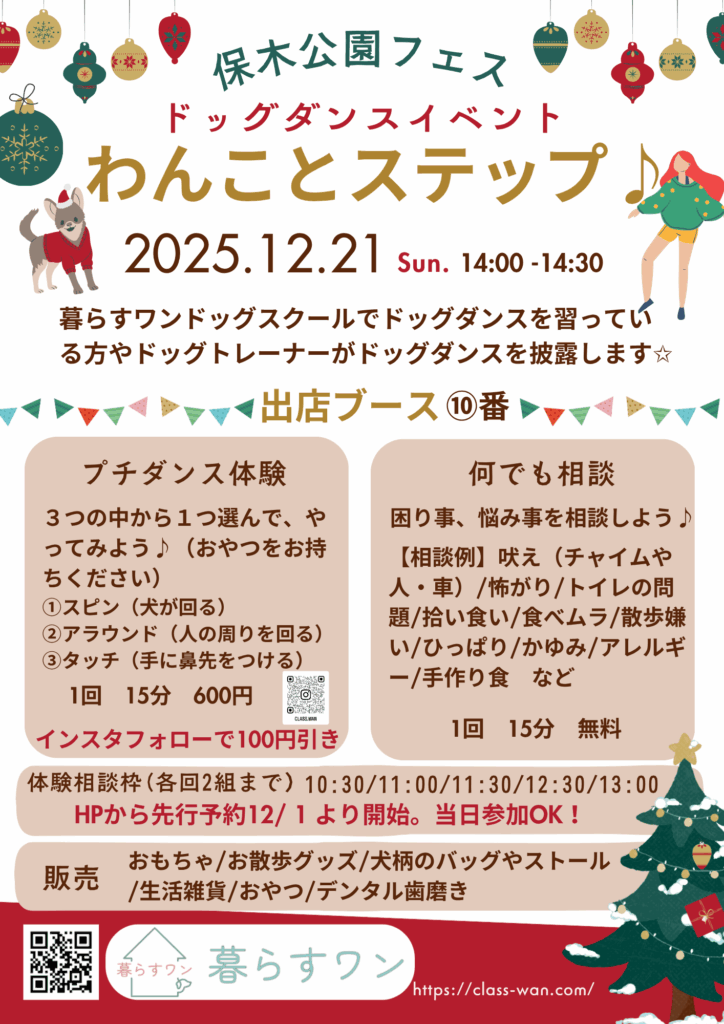 保木公園フェスのステージや店舗について詳細が決定しました。店舗では犬グッズやおやつ販売とともにプチダンス体験と相談会を行います。事前予約は12月1日から受け付けます。ぜひお越しください。